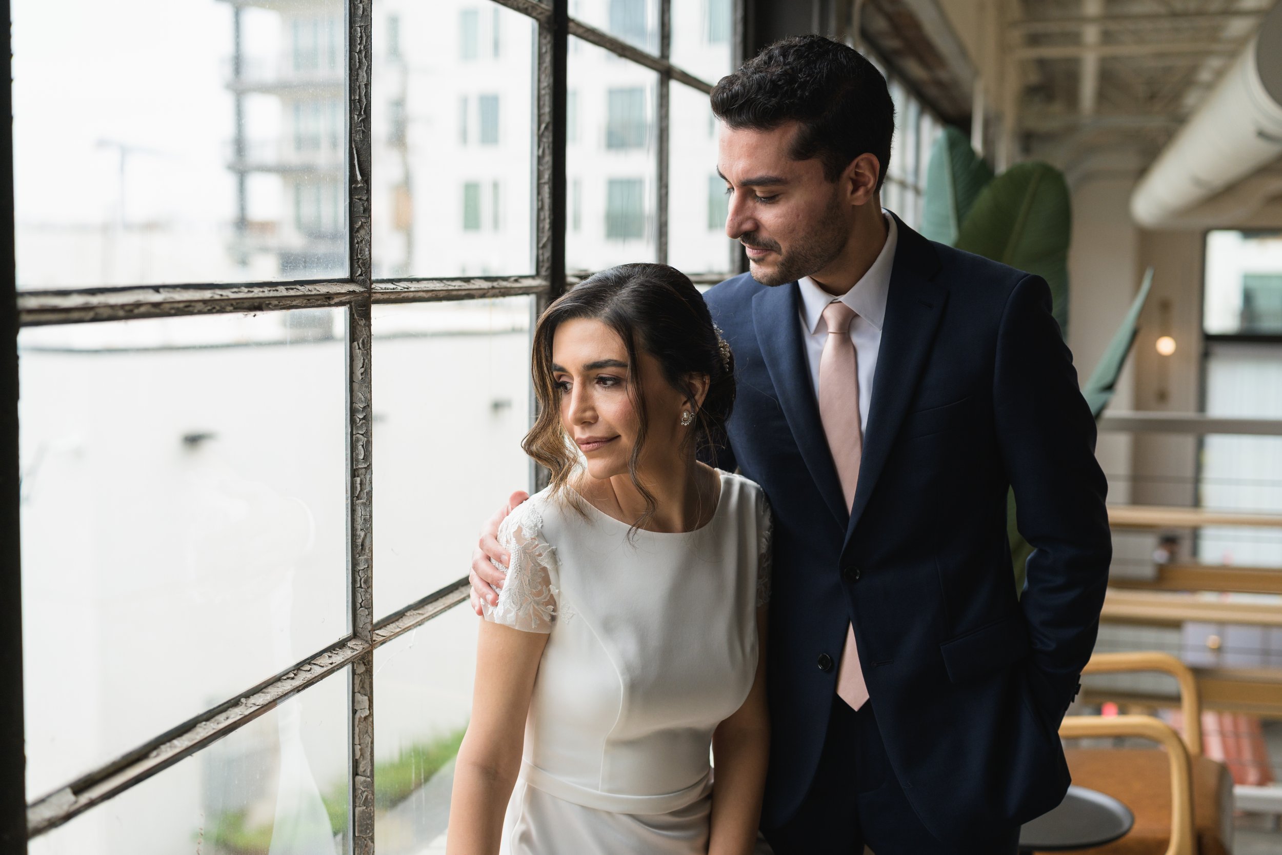 Couple looking out a large window at PINE wedding venue in Charlotte.